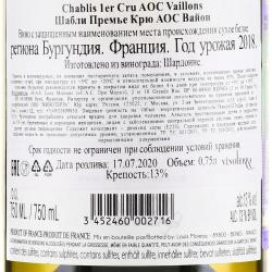 Chablis Vaillon — небольшой участок на территории французского региона Шабли, который классифицируется как Premier Cru. Эта местность, представленная посадками лоз Шардоне с юго-восточной экспозицией (общая площадь 129 га), расположена к юго-западу от города Шабли. Почвы состоят из древних известняковых отложений и благоприятны для выращивания классических белых сортов, у которых формируют отчетливую минеральность во вкусе. Климат прохладный, с достаточным количеством солнечных дней для вызревания ягод с высокими органолептическими показателями.