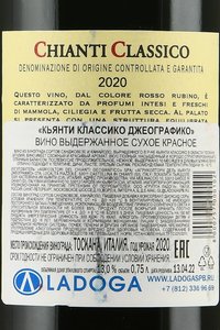 Вино Chianti Classico DOCG бывает только красным сухим и производится в отдельной винодельческой зоне внутри общего апелласьона Кьянти DOC. Она имеет более высокий статус в плане качества — вторая ступень в классификационной пирамиде. Это историческая область, в которой виноделие зародилось еще в эпоху этрусков. Как самостоятельная зона DOCG она была определена в 1996 году.