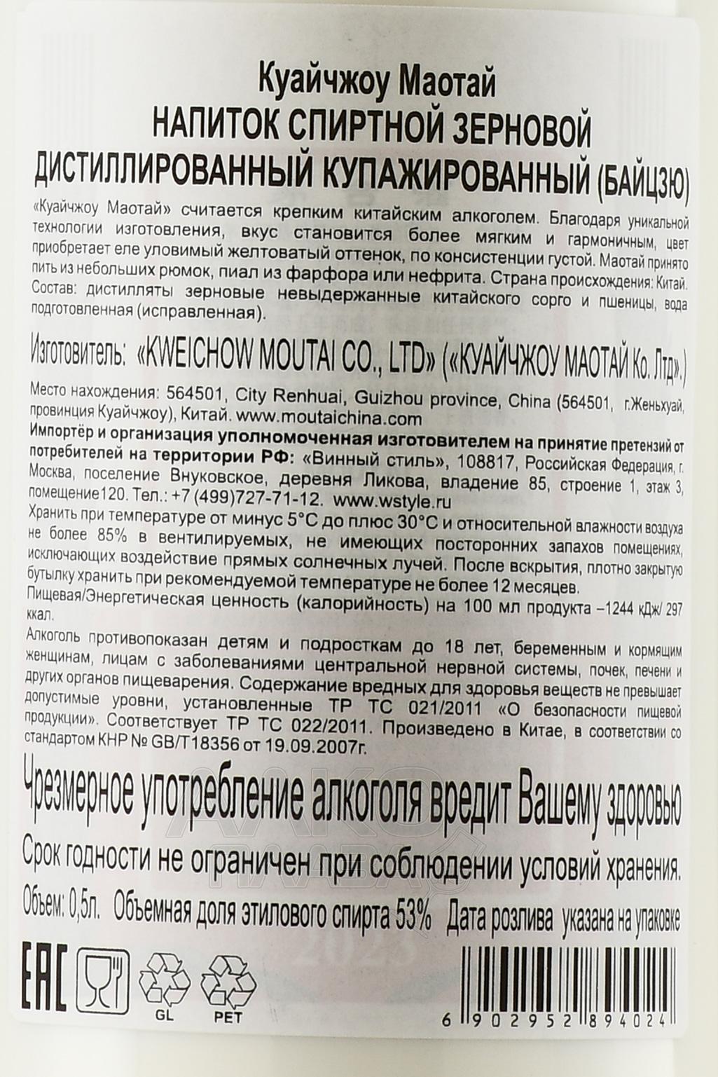 Байцзю Kweichow Moutai 0,5 л отправляется на реализацию в бутылке с узнаваемым дизайном, которая сопровождена картонным боксом с подробной информацией о напитке. Также в наборе представлены две рюмки, идеально подходящие для дегустации спиртного. Его изготовление осуществилось на передовом китайском заводе. Основой байцзю стали зерновые (сорго и пшеница с полей страны производства), прошедшие этапы ферментации и дистилляции.