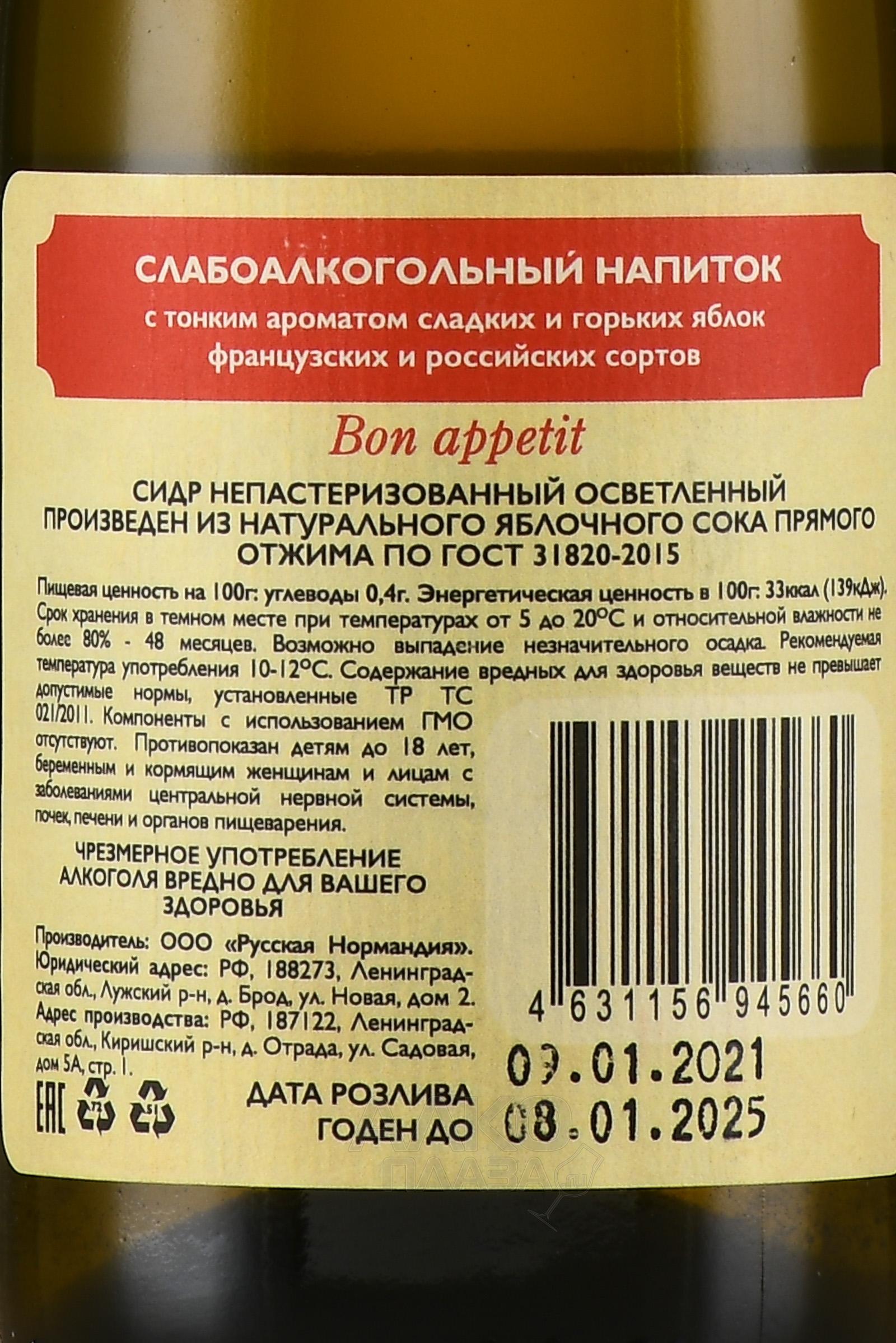Сидр сухой игристый Русская Нормандия Брют 0,375 л в компактной бутылке послужит сувениром для коллекционеров алкоминималистики. В качестве сырья производитель использует яблоки российских и французских сортов. Плоды выращиваются в собственном саду компании и отправляются на переработку на завод, в запуске которого участвовал руководитель департамента сидра и кальвадоса Французской сельскохозяйственной академии Фредерик Ревьяр. Согласно традиционной технологии из плодов отжимают сок, который оставляют бродить в течение определенного времени. Готовый напиток не пастеризуется и разливается в бутылки после легкой фильтрации.