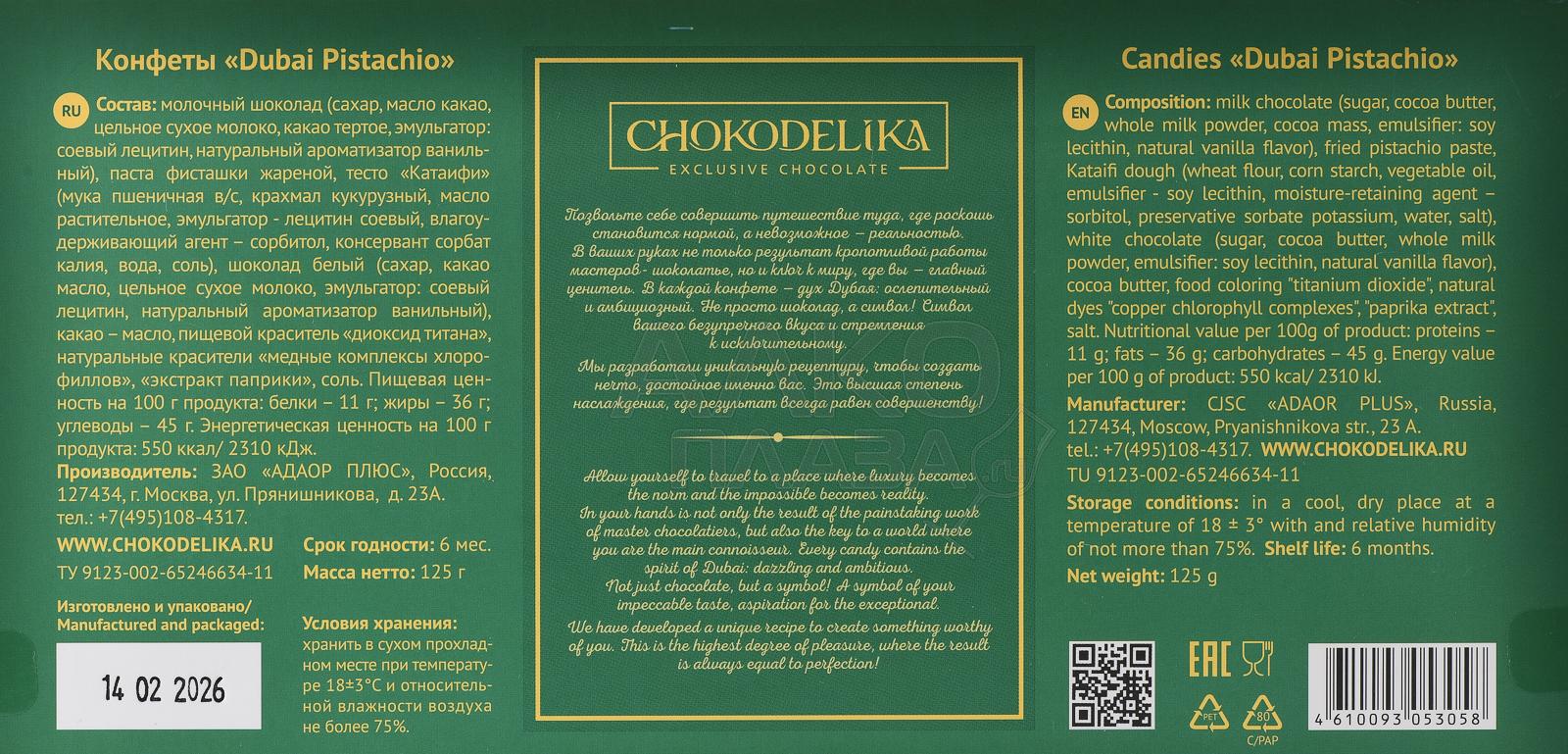 Шоколад Чокоделика молочный Дубай Фисташка 125 г