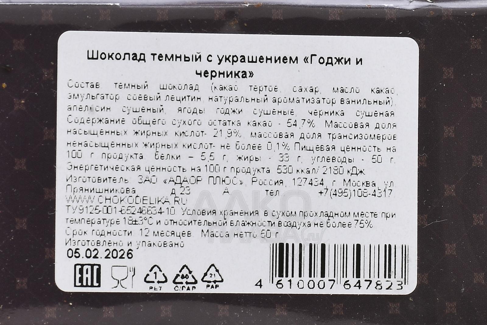 Шоколад Чокоделика тёмный с украшением Годжи и Черника 50 г