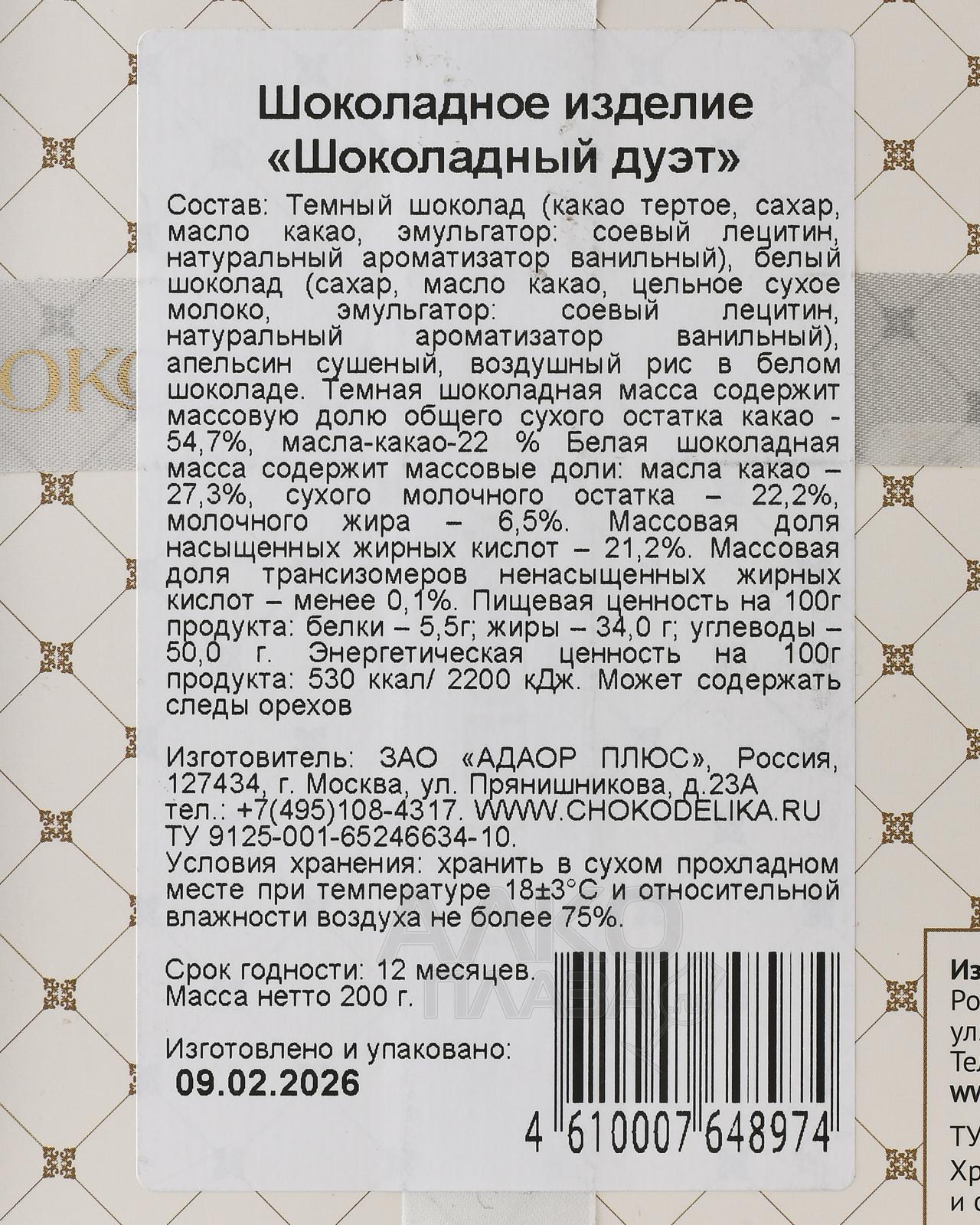 Шоколад Чокоделика тёмный с украшением Шоколадный Дуэт 200 г