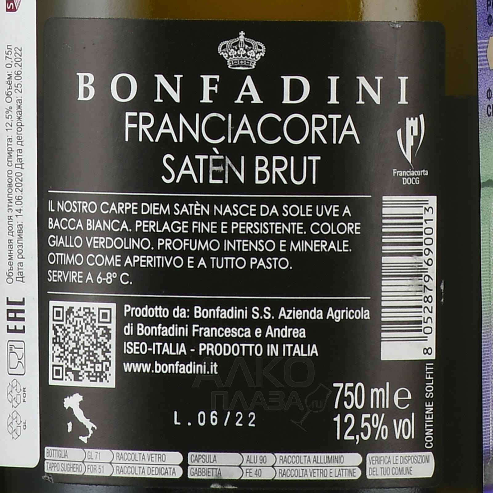 Вино игристое белое Bonfadini Franciacorta Carpe Diem Saten 2019 г. 0,75 л – брют из винограда ручного сбора. Созревшие под итальянским солнцем ягоды одного года сбора на винодельне прессуют для получения сока. Сусло ферментируется в стальных резервуарах и бочках из французского дуба. Спустя семь месяцев спиртное переливают в бутылки и подвергают вторичному брожению и шампанизации. Далее в течение двух лет напиток созревает на осадке.