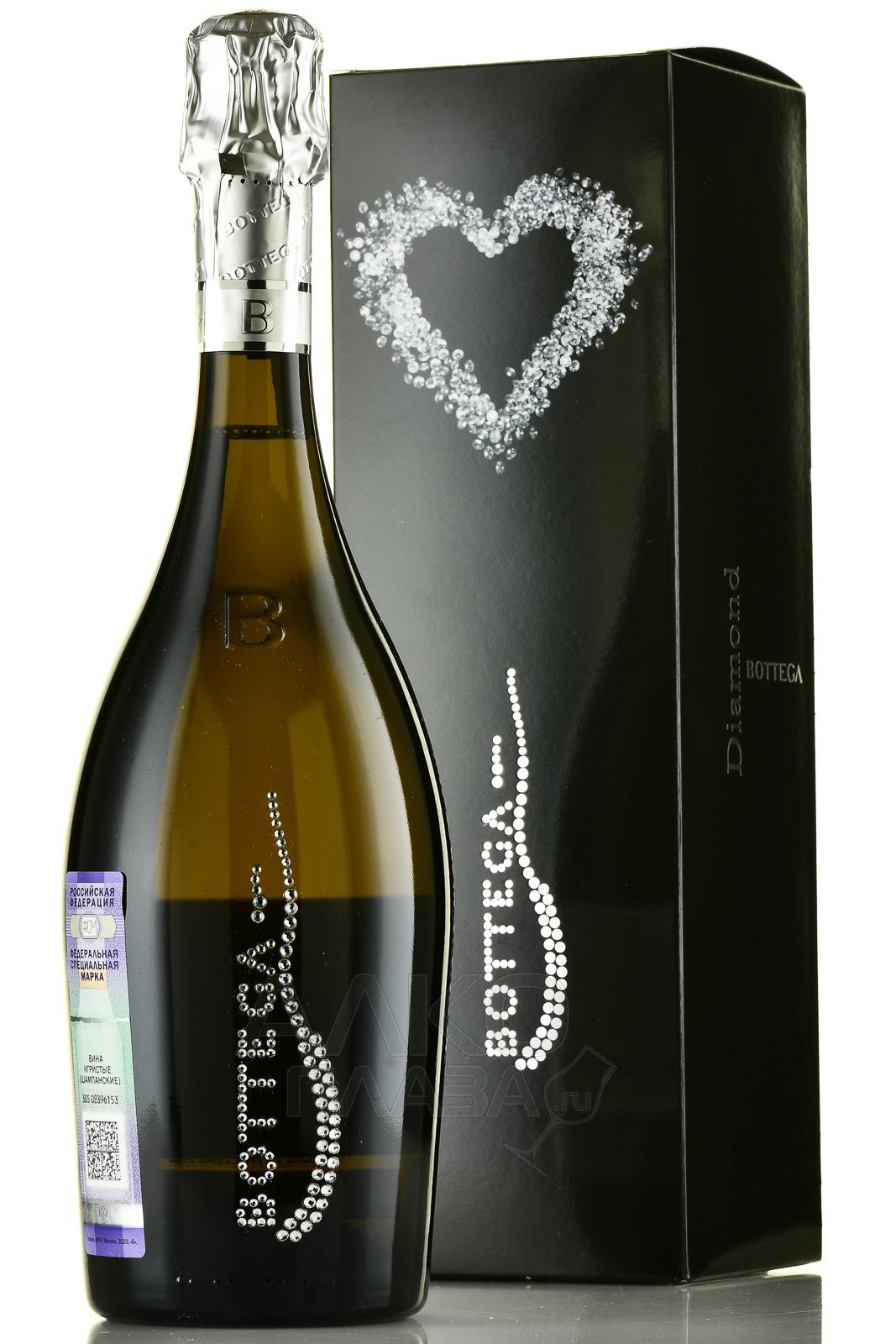 Белое сухое игристое вино Bottega Diamond 2022 год 0,75 л — 12-градусный экземпляр высокого качества из Италии, который предлагается в подарочном варианте упаковки: темная бутылка сопровождена картонным гифт-боксом. Коробка декорирована принтом, изображающим россыпь бриллиантов в форме сердца. Благодаря гарантированному качеству и красоте оформления тары, игристое вино является идеальным подарком для множества людей. Напиток из стопроцентного винограда Пино Нуар создали в Венето посредством сбраживания в стальных баках (все процессы выполнили в соответствии с методом Шарма-Мартинотти). Лучше всего дегустировать игристое вино сразу после покупки, ведь оно не предназначено для долгого хранения в бутылке.