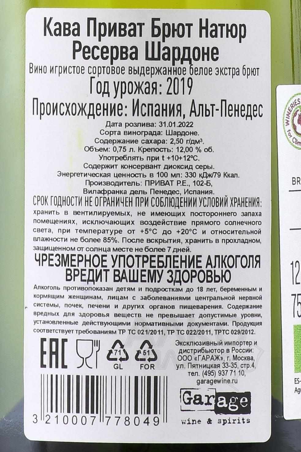 Cava Privat Reserva Chardonnay - вино игристое Кава Приват Резерва Шардоне 0.75 л белое брют натюр