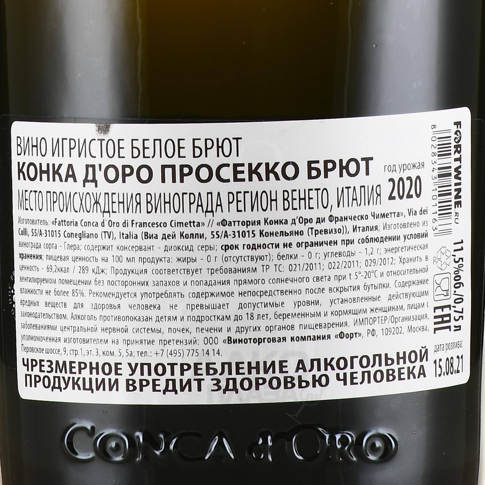 Белое сухое игристое вино Conca d`Oro Prosecco Brut 2020 г. — итальянский брют с уровнем содержания алкоголя 11,5%, который был произведен на ограниченном участке области Veneto из одного сорта местного винограда. Изготовление высококачественного винтажа на базе ягод сентябрьского сбора прошло в емкостях из нержавеющей стали в соответствии с технологией Шарма. Ежегодно эта вариация производится количеством около 90 тысяч бутылок.