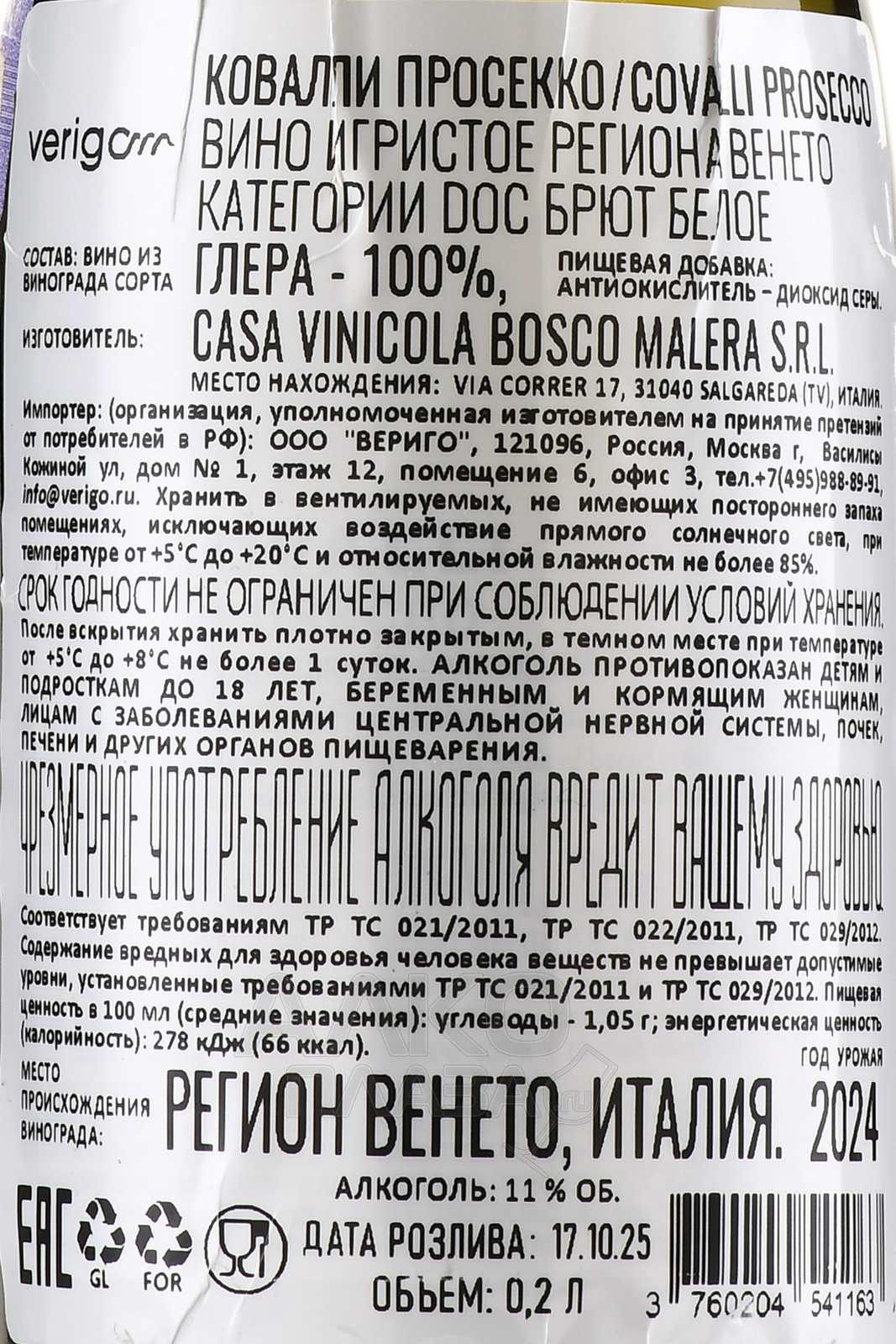Covalli Prosecco DOC - вино игристое Ковалли Просекко ДОК 0.2 л белое брют