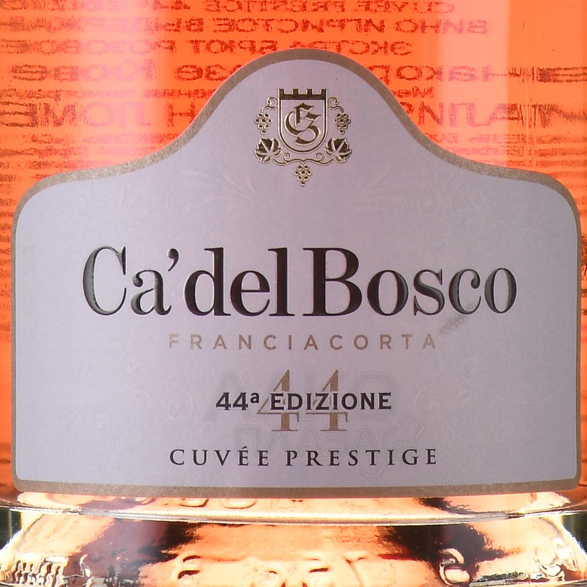 Розовое игристое вино Ca’Del Bosco Franciacorta Rose Cuvee Prestige 0.75 л в п/у — купажированный итальянский экстра-брют в подарочной упаковке, созданный из урожая определенного года — сортов Пино Неро и Шардоне, выращенных в Ломбардии в апелласьоне Franciacorta DOCG. Вино произведено методом шампенуаз, при котором вторичная ферментация проходит в бутылках. Алкогольная ферментация протекает при температуре 20 °С в стальных чанах, где вино выдерживают 8 месяцев. Каждый сорт винифицируется отдельно. После ассамбляжа вино разливают по бутылкам, где оно в течение 3 лет выдерживается на осадке. Потенциал развития франчакорты — от 5 до 7 лет.