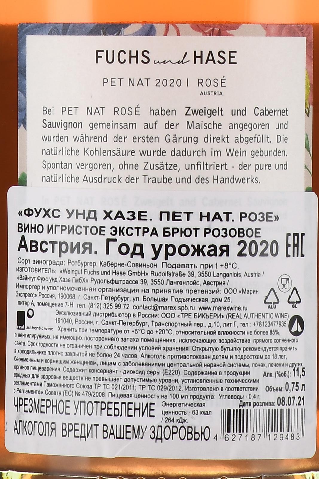 Игристое розовое вино Fuchs und Hase Pet Nat Rose 0,75 л — экстра-брют с минимальным содержанием сахара (до 0,4 г на литр). Место производства — регион Кампталь в Нижней Австрии. Здесь культивируются сорта Ротбургер и Каберне Совиньон в мягком и благоприятном климате. Сбор сырья осуществлялся вручную с молодых лоз. Виноград мацерировали целыми гроздьями для получения красивого розового цвета, затем сусло ферментировали в стальных чанах при постоянной температуре. Брожение было прервано и затем продолжено в бутылке. Такой старинный способ называется Pet Nat. Экстра-брют выдерживался на тонком дрожжевом осадке 6 месяцев и не подвергался фильтрации.