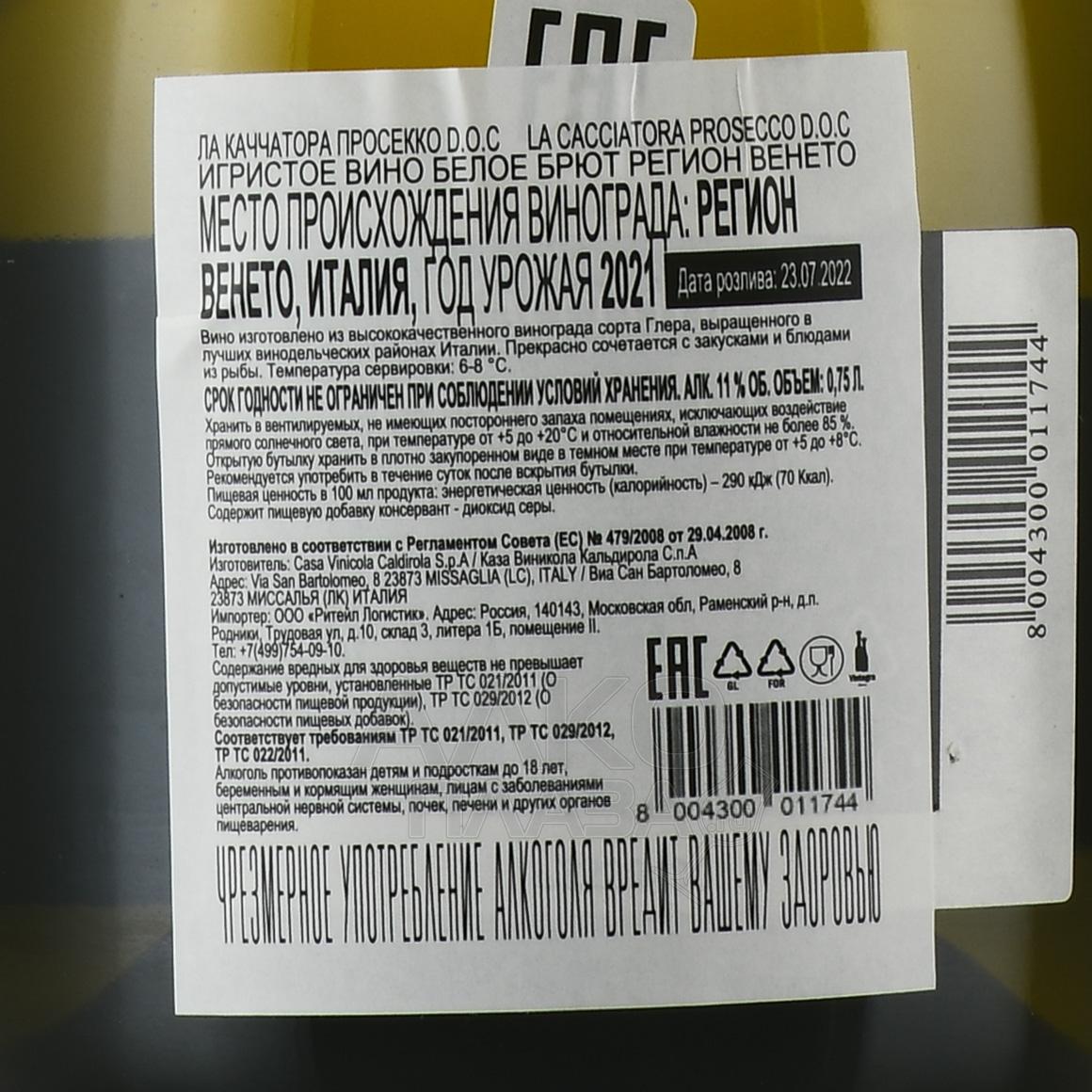 Игристое вино La Cacciatora Prosecco DOC 2021 г. 0,75 л — элегантный белый брют из винодельческой зоны защищенного наименования Просекко. Она находится на территории региона Венето, в зоне прохладного микроклимата, в котором отлично себя чувствует и хорошо вызревает белый сорт Глера. Его собирают на пике спелости и винифицируют по методу Шарма со строгим соблюдением всех технологических стандартов. Классический просекко проходит недолгую выдержку на осадке и остается молодым и свежим. Вариация из урожая 2021 года, разлитая в бутылку в июле 2022 года, имеет срок годности не более 2-3 лет.