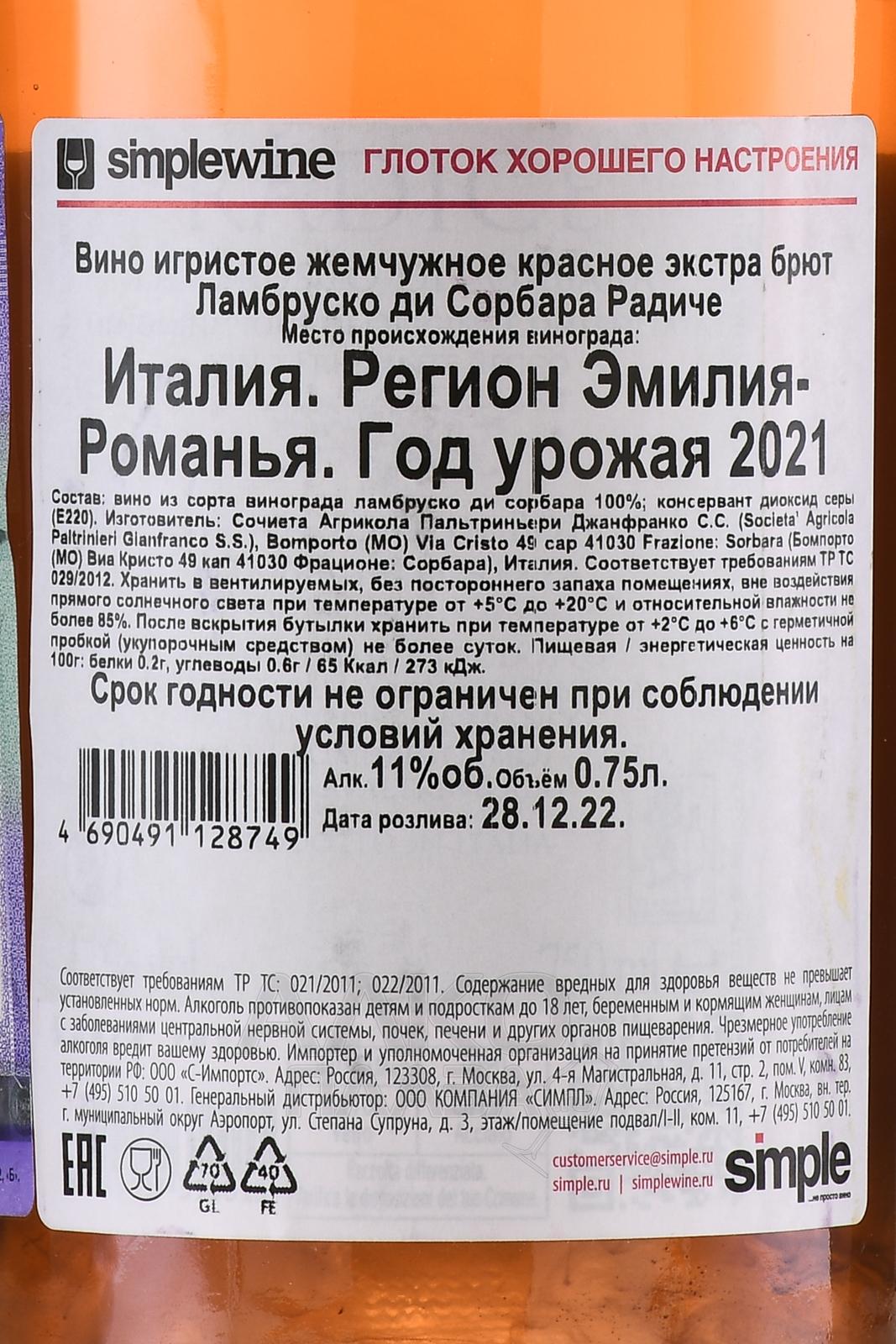 Lambrusco di Sorbara Radice Paltrinieri - вино игристое Ламбруско ди Сорбара Радиче 0.75 л
