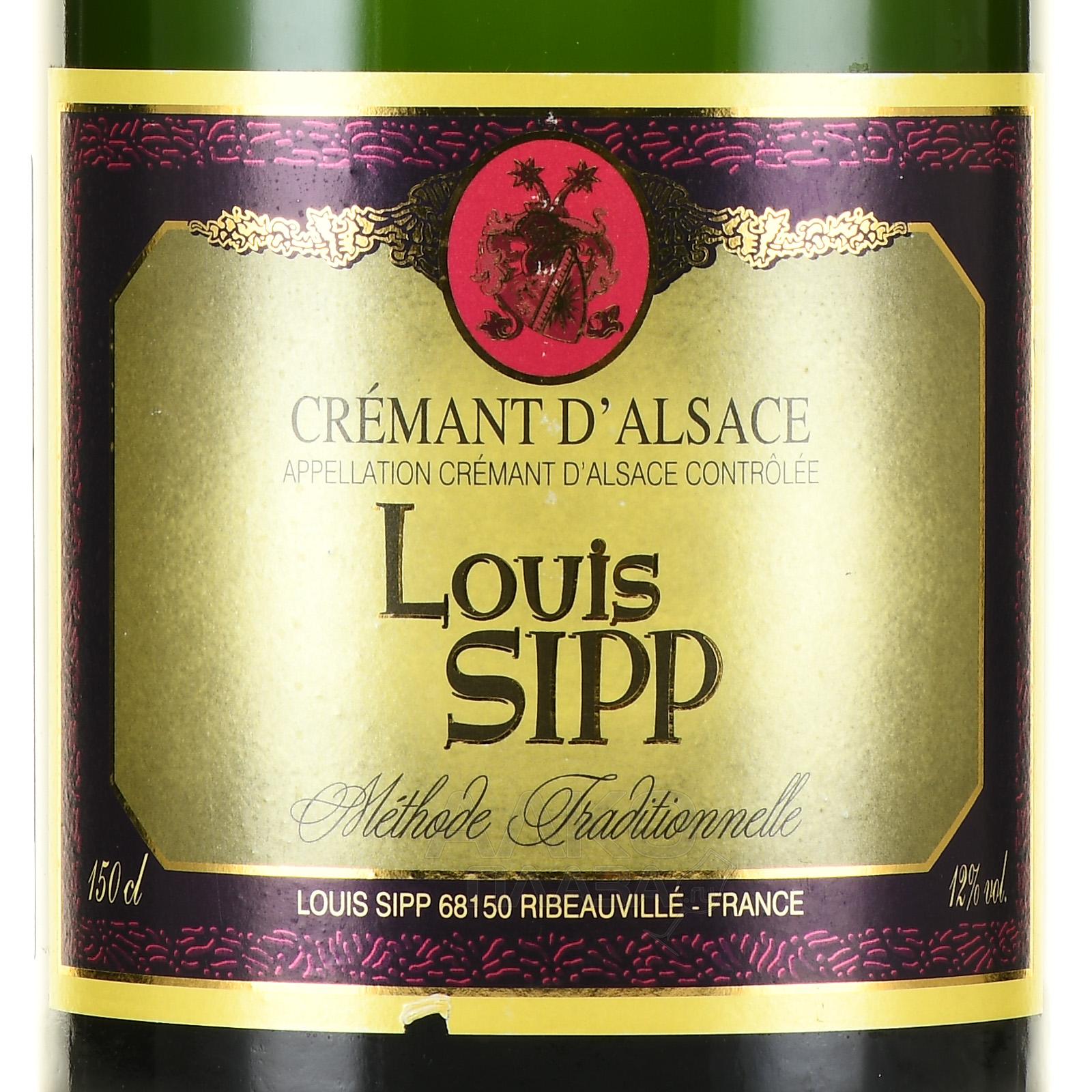 Игристое вино Louis Sipp Cremant d`Alsace Brut АОС 1,5 л – купажированный белый брют в большом формате объема из Франции, созданный из нескольких сортов винограда, произрастающих на плантациях в зоне геологического разлома в регионе Рибовилль. Местные почвы преимущественно состоят из меловых пород, а также из мергеля, известковых пород, глины и песчаника. Такой разнообразный состав почв обуславливает комплексный, многослойный вкус и элегантный характер вина. Шипучий напиток создается традиционным способом. Винификация проходит без использования яблочно-молочного брожения, благодаря чему сохраняется его структура, утонченность и обеспечивается хороший потенциал выдержки.