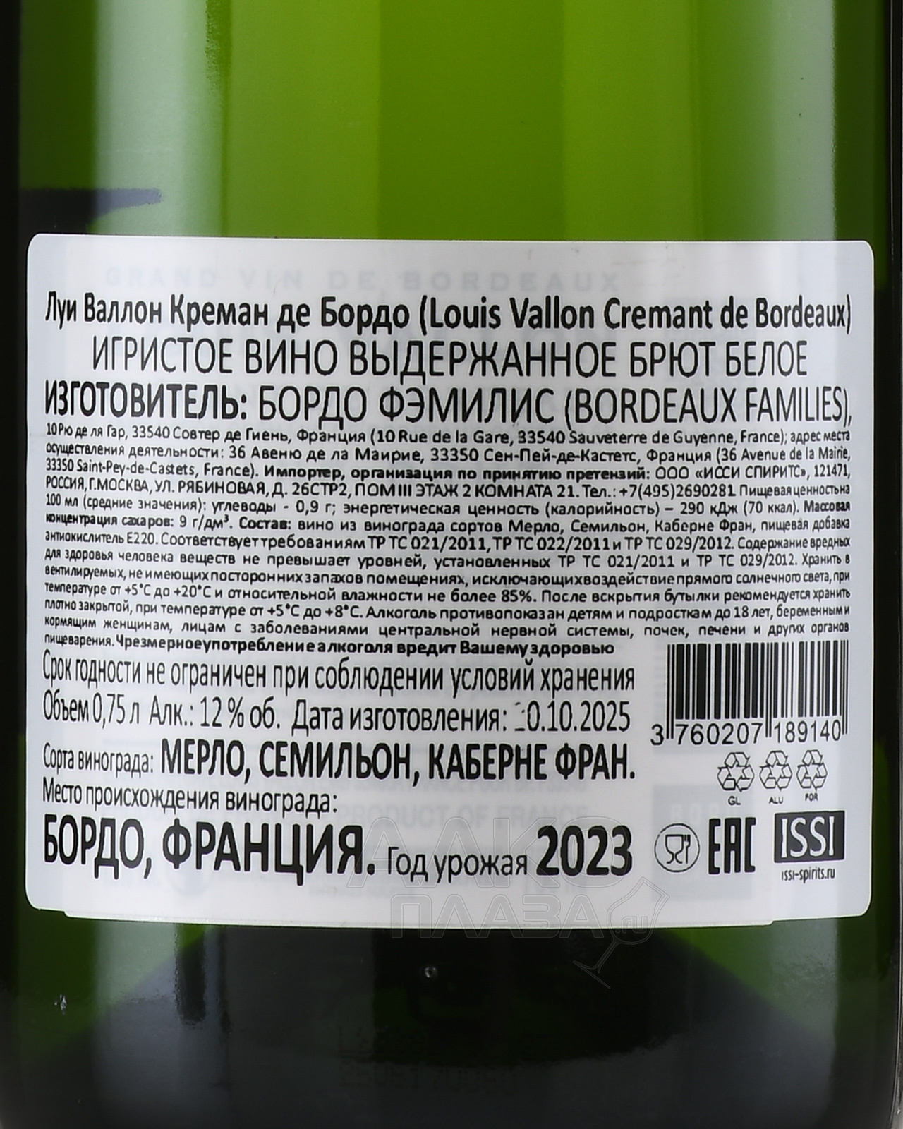 Белое игристое вино Louis Vallon Cremant de Bordeaux 0,75 л производится по традиционному методу на территории Бордо с использованием типичных сортов винограда. Сбор урожая проводится ручным способом, после чего сортируется и далее подвергается прессованию. Процесс первой ферментации проходит в стальных чанах, по завершении которой готовый брют переливают в бутылки с добавлением тиражного ликера. Вторая ферментация протекает в течение 1 года.