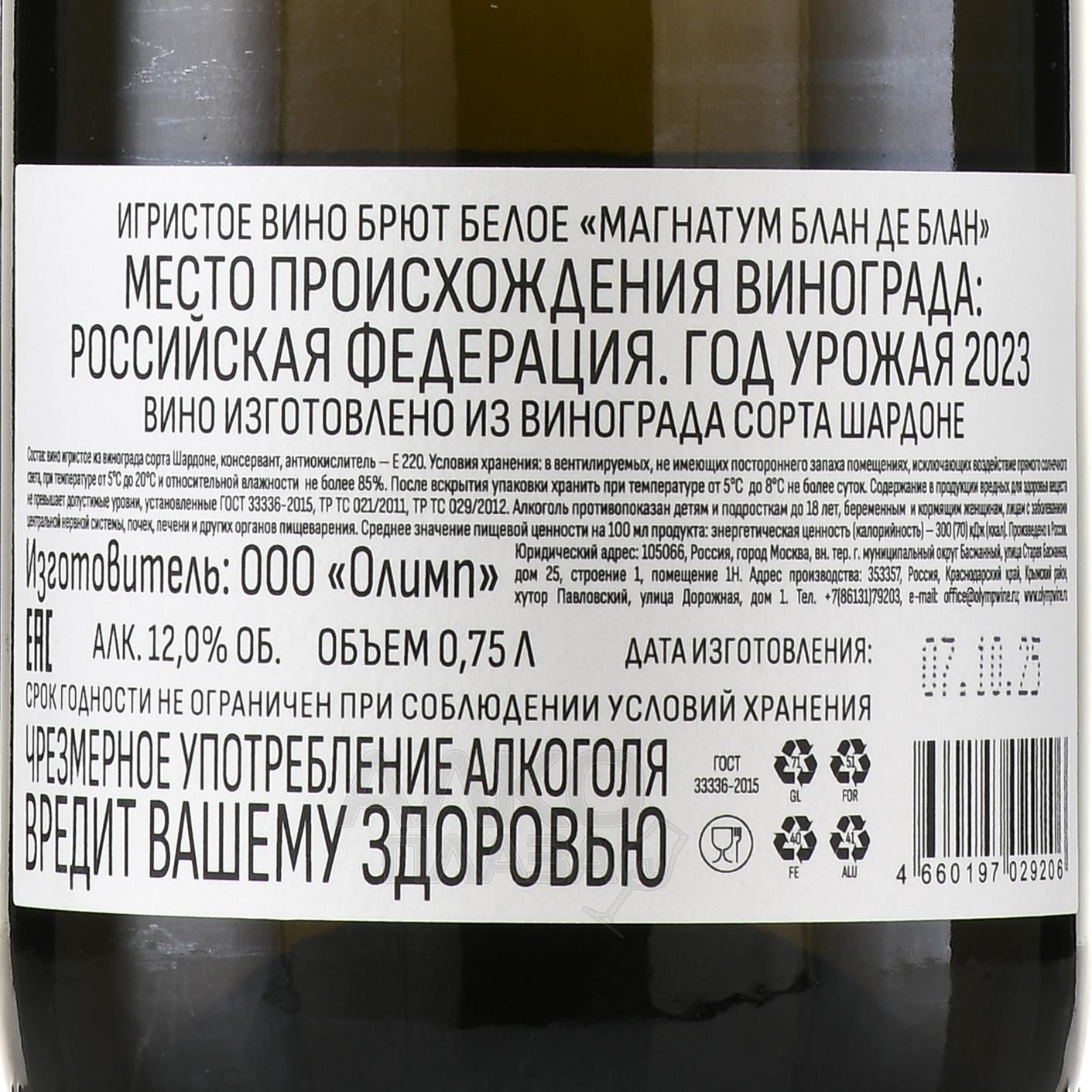 Игристое вино Magnatum Brut Blanc de blancs 0,75 л — элегантный белый брют с содержанием сахара 8 г на литр. Для его производства использовался сорт Шардоне, культивируемый в Крымском районе Кубани. Виноградник разбит на склоне Гипсовой горы, на участке с мергелевыми почвами. Сбор урожая осуществляется ручным способом. Ферментация протекает в стальных емкостях. Брют выдерживается на тонком осадке 18 месяцев.