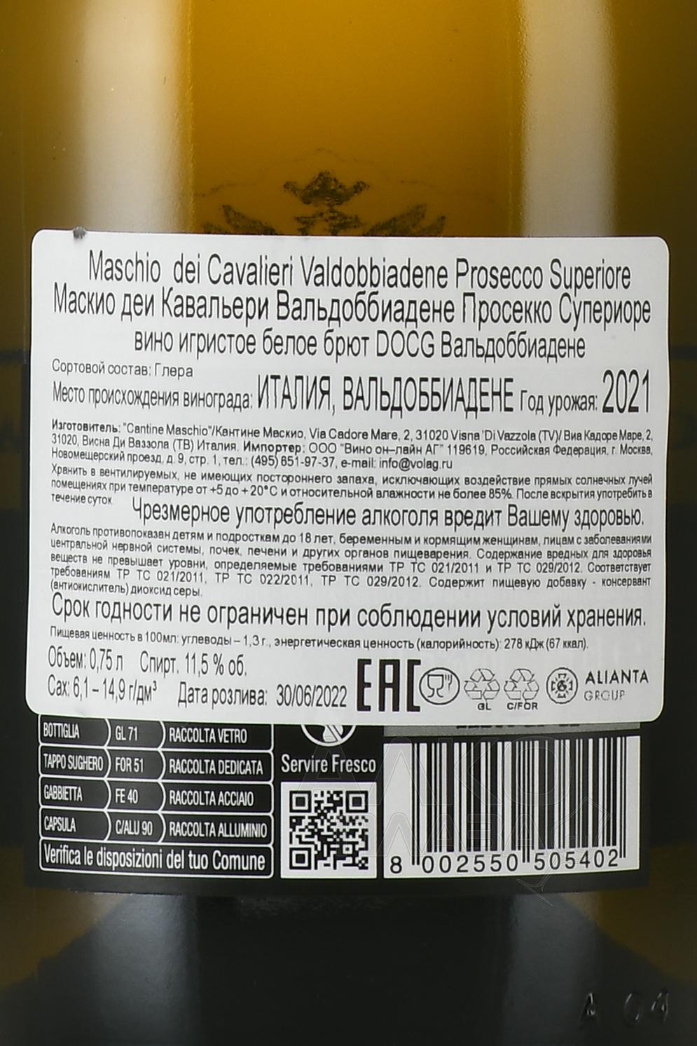 Белое сухое игристое вино Maschio dei Cavalieri Valdobbiadene Prosecco Superiore 2021 г. 0,75 л имеет статус контролируемого наименования по месту происхождения, что свидетельствует об оригинальности и высоком качестве. 11-процентный напиток итальянского производства изготовили на территории региона Венето из местного винограда одного года сбора, обработанного в соответствии с методикой Charmat.