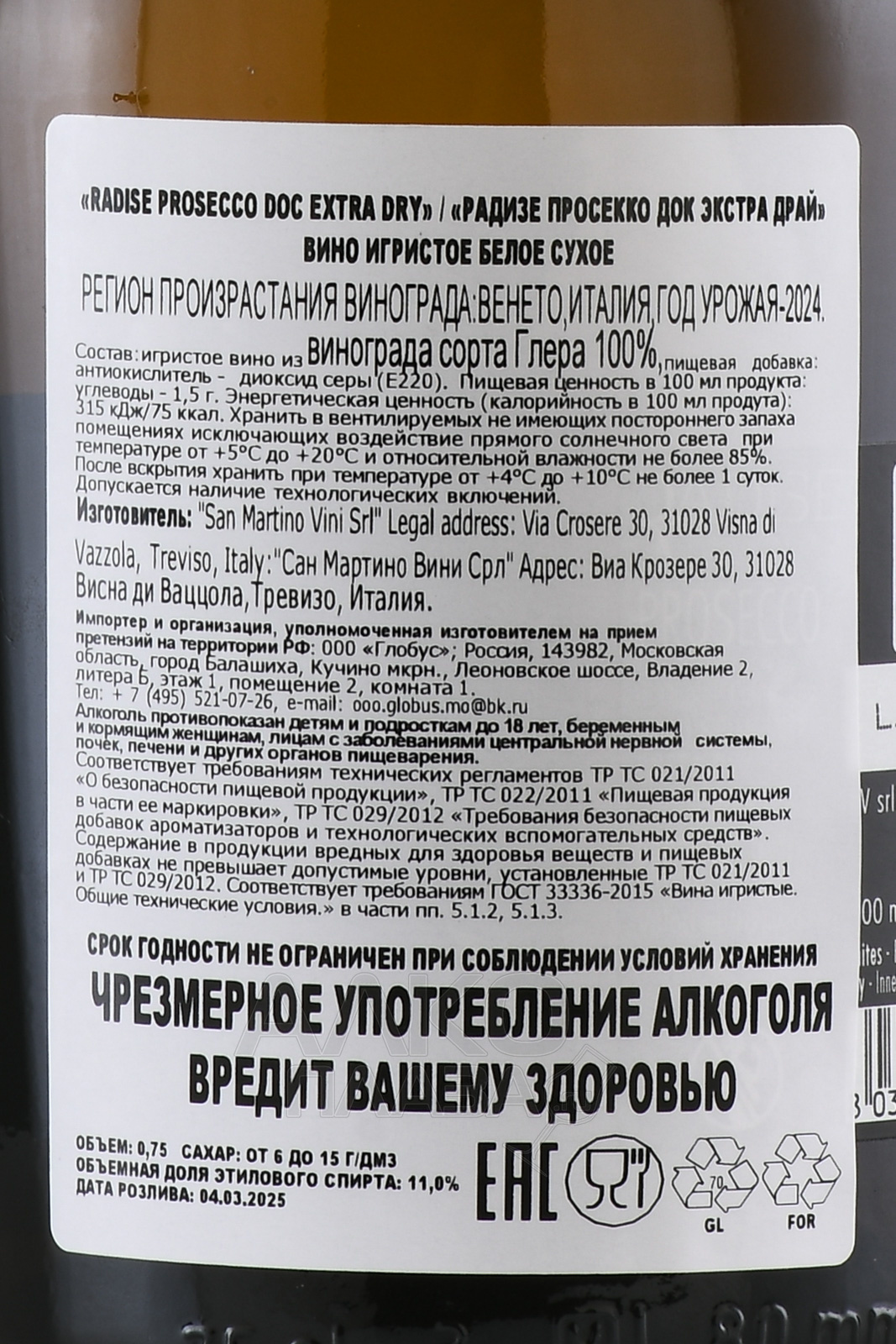 Игристое белое вино экстра-драй Radise Prosecco DOC 0,75 л создано в зоне, которая считается сердцем производства высококлассного Просекко. Виноградники расположены на крутых холмах Конельяно и Вальдоббьядене, где высота участков достигает 300–450 метров. Почвы состоят из морены, песчаника и известняка, формирующих выразительный стиль винограда и повышающих его кислотность. Мягкий климат с прохладными ночами и тёплыми днями помогает ягодам сохранить свежесть и насыщенность. Для производства используют строгие стандарты категории Супериоре, включая ручной сбор и отбор. Напиток делают методом Шарма с длительной вторичной ферментацией.