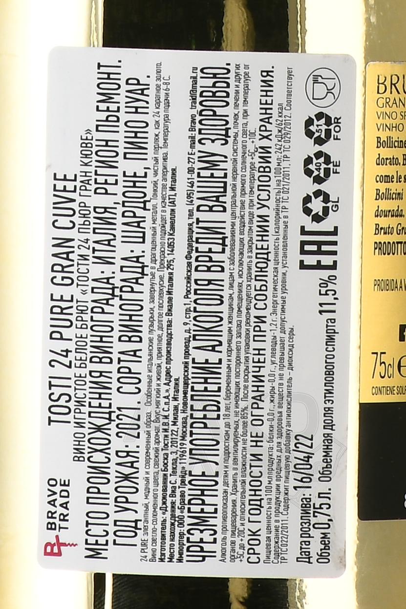 Белое игристое вино Тости 24 Пьюр Гран Кюве 0,75 л – купажированный напиток, изготовленный из белых сортов винограда. Спелый урожай аккуратно собирается и сортируется, после чего проходит мягкое прессование. Охлажденное сусло винифицируется при низких температурах. При добавлении сахарного сиропа происходит повторная ферментация в автоклаве. Готовый напиток бутилируют после выдержки на осадке и мягкой фильтрации. Шампанское обладает тонким перляжем из изысканных пузырьков, которые блестят как 24-каратное золото. Праздничный вид золотой бутылки станет отличным украшением любого стола.