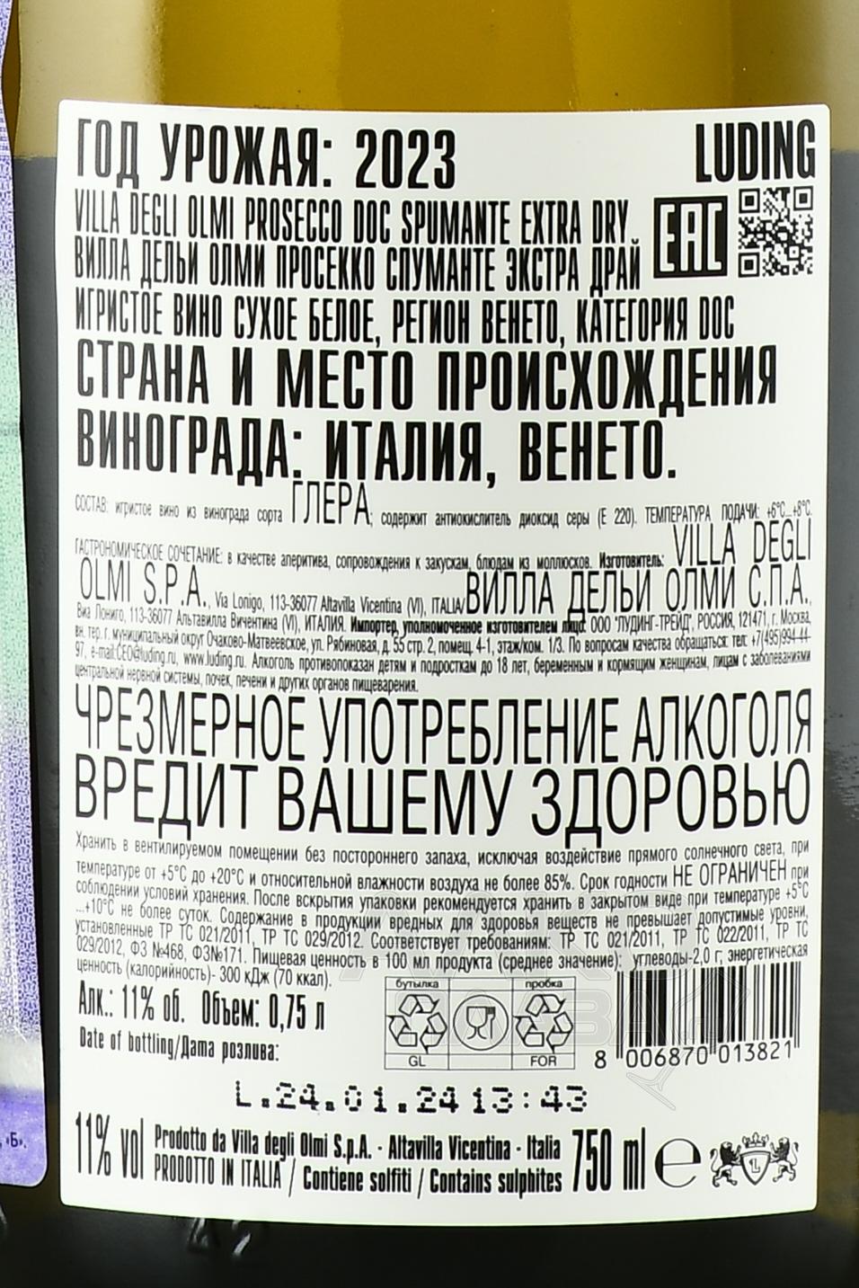 Игристое белое сухое вино Villa degli Olmi Prosecco Spumante Extra Dry 0,75 л в п/у получено традиционным для данной категории спиртного способом из ягод итальянского автохтона со светлой кожицей. Винификация включает два этапа ферментации – в стальных резервуарах и автоклавах под давлением. Напиток, происходящий из региона с контролируемым наименованием, предлагается в сувенирном формате, благодаря чему может послужить элегантным презентом в честь торжества.