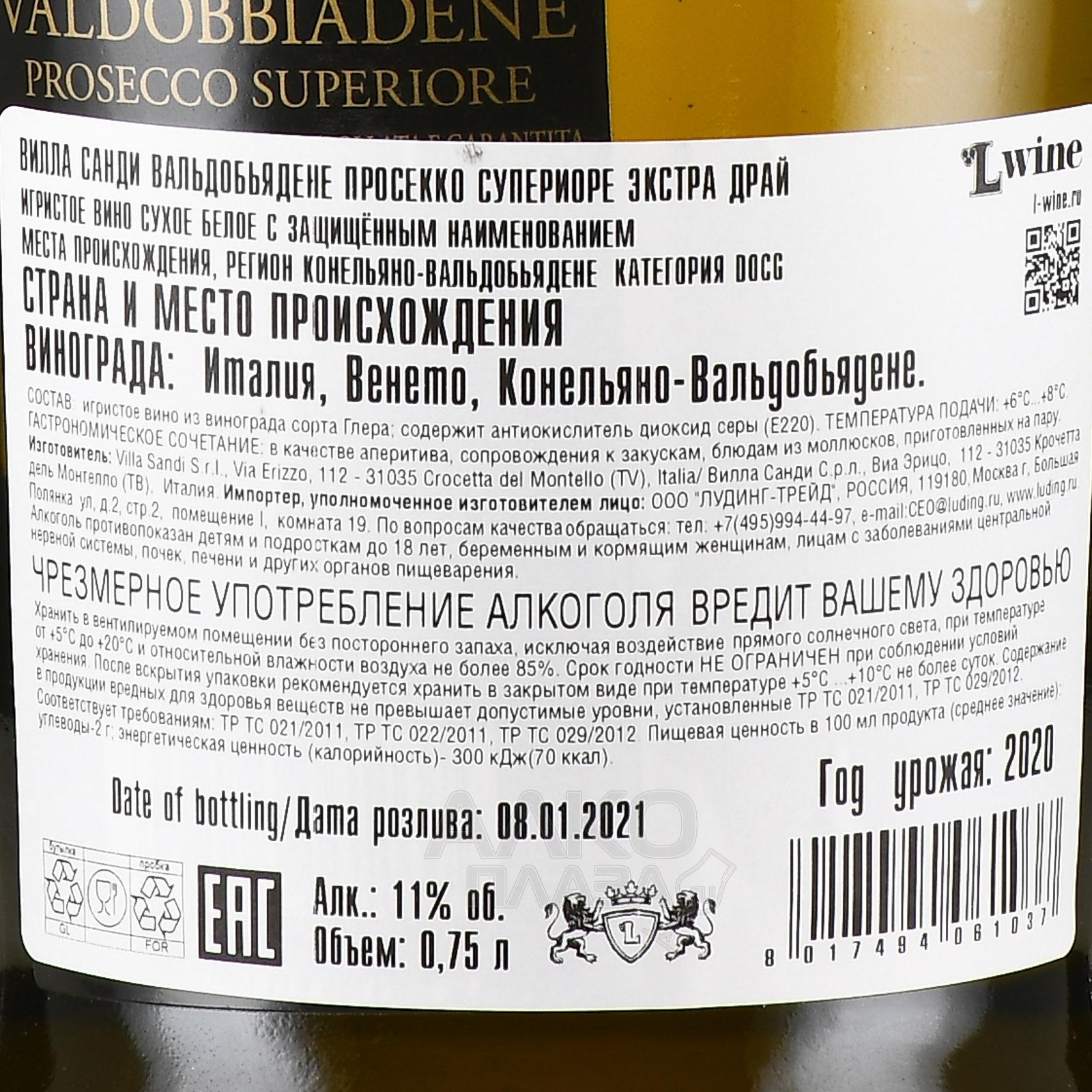 Белое игристое сухое вино Villa Sandi Valdobbiadene Prosecco Superiore DOCG Extra Dry — знаменитая вариация итальянского происхождения, находящаяся на высшей ступени классификации виноградного алкоголя страны производства. Его основой послужил аборигенный сорт винограда, выращенный на экологически чистых угодьях зоны Вальдоббьядене региона Венето. Напиток произведен в соответствии с методикой Шарма (вторичная ферментация в стальных чанах). Его спиртуозность средняя — 11 %.