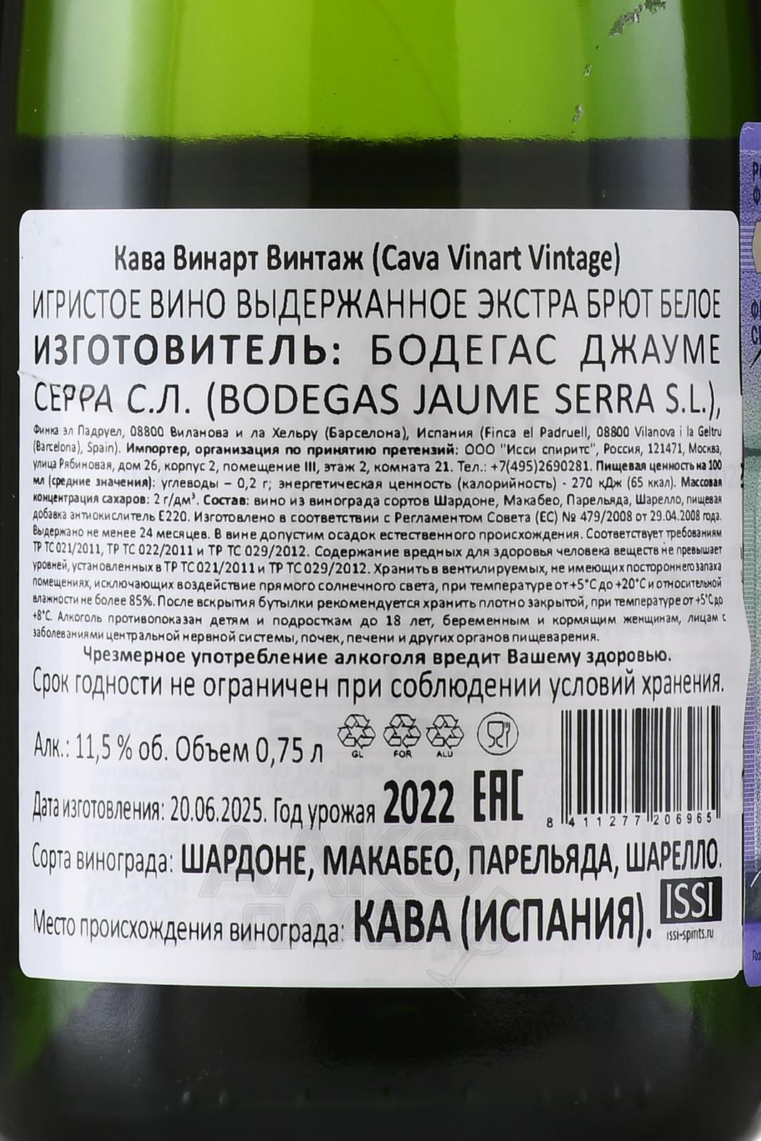 Белое игристое вино Vinart Vintage Cava 0,75 л – брют-натюр, созданный классическим методом шампанизации. На винификацию пошли ягоды сортов, популярных в регионе Кава. В погребе отжатый из плодов сок ферментировался в стали, а затем – в бутылках. В завершение напиток был выдержан в течение 18 месяцев, что придало ему сбалансированный и выразительный органолептический профиль.