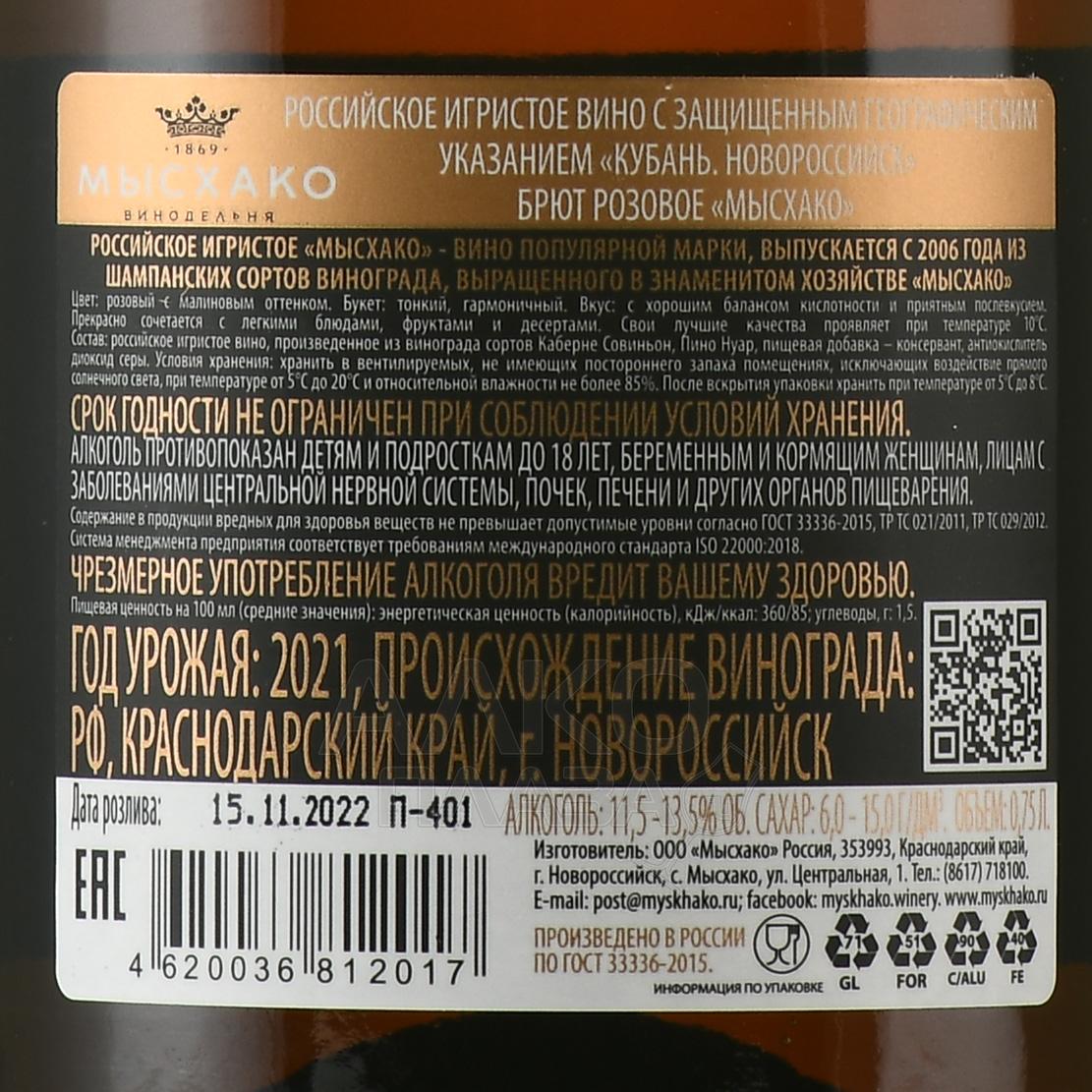 Розовое игристое вино Мысхако 0.75 л — российский брют с защищенным географическим указанием «Кубань Новороссийск», созданный из купажа Каберне Совиньон и Пино Нуар одного года сбора, которые поспели на виноградниках хозяйства Мысхако. Игристое розе изготавливается классическим способом Шарма.