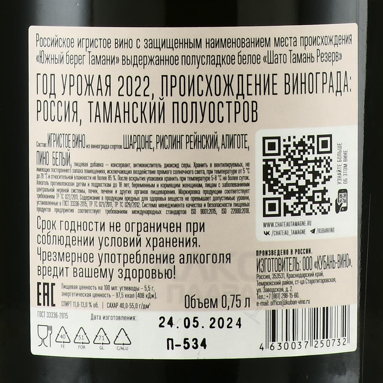 Белое полусладкое вино игристое Шато Тамань Резерв 0,75 л произведено из максимально спелого винограда с высокой сахаристостью. 4 белых сорта были выращены в зоне с защищенным наименованием места происхождения «Южный берег Тамани». Сусло получили методом самотека. Применялась классическая технология винификации, которая подразумевает проведение первичного (в стальных резервуарах) и вторичного (в бутылках) брожения. На тонком осадке в бутылке игристое вино категории резерв выдерживалось не менее 9 месяцев. Оно станет отличным дополнением к любому празднику.
