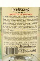 Водка Гусь Важный — уникальный крафтовый алкоголь, который выдерживался в дубовой бочке. Эта технология впервые используется производителем из России. Рецептура напитка была придумана братьями Гусевыми и изготовлена на оборудовании ООО «НАМА». Святослав и Николай Гусевы — владельцы собственной винодельни в Краснодарском крае. Они решили расширить ассортимент продукции и начали выпускать авторскую водку из экологически чистого сырья.