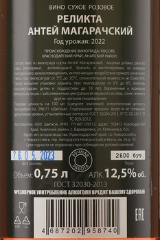 Название бренда Реликта связано с идеей сохранить и восстановить исчезающие и редкие сорта винограда, такие как Первенец Магарача, Антей Магарачский и Декабрьский, высаженные ещё в советский период. В ассортименте представлены тихие красные, белые и розовые вина, а также игристые версии. Всего выпускается восемь наименований. В производстве используются как классические сорта (Каберне Совиньон, Рислинг, Шардоне, Совиньон Блан и т.п.), так и уникальные разновидности советской селекции. На винодельне установлено современное итальянское оборудование: сортировочные линии, пневматические прессы и емкости из нержавеющей стали. Игристые вина делают по традиционной технологии, выдерживая их в дубовых пюпитрах с регулярным ремюажем.